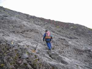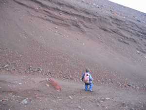 雲の中の富士宮口五合目から出発。宝永第一火口底に着き、宝永山へ登り始める。雲が割れ晴れ出す。宝永山の馬の背から、お中道の横断へ。御殿場口登山道を横切り、砂石地帯へ。間もなく砂石が流失して、V字谷が幾つか出来てきた。二つ目のものは、谷が深く側壁が急でとても登り返せない。対岸に渡れそうなところまで下り、左岸に移る。