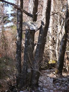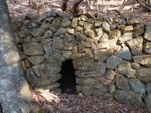 何箇所か、炭焼きカマ跡がある。1300m付近には、完全に姿の炭焼きカマが残っていた。 1380m地点の尾根上には、かつての伐採に使ったものか、ワイヤーが尾根を横断していた。