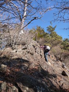 いつの間にか、下部病院裏手からの尾根と合流すると、なだらかな尾根上となる。 その先で、岩場を通過する。