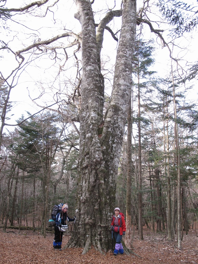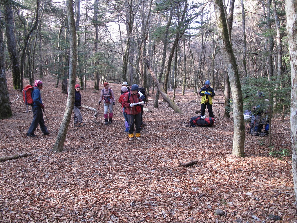 恒例になった新春山行は登山道のない山で富士山最大の側火山「大室山」。会員8名と松浦 さんの友人などビジター3名でにぎやかになった。大室山ブナ林の看板のところから登り 始める。