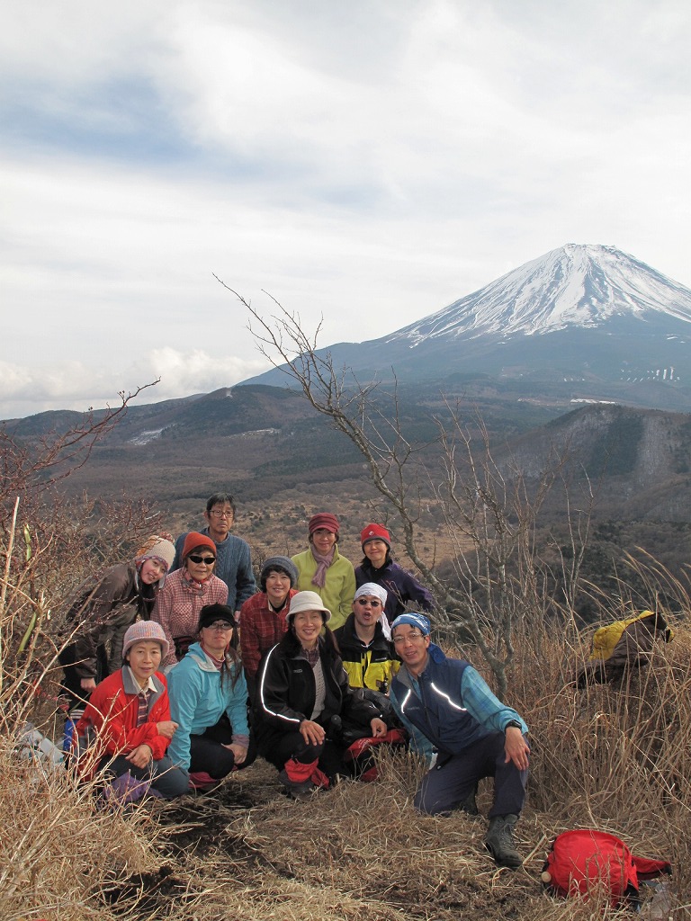 急斜面の登りは歩きにくく、遅れる人が出る。山頂手前で待って足並みを揃える。 10年前に登ったが、心配だったので2週間前に下見したところ笹がひどかったので今回 は鎌やナタを準備してみんなで刈りながら山頂から三角点までのルートを作る。 約1時間 かけて刈るが背丈以上の笹は竹のように成長していて鎌でも手強い。一部不明瞭な場所が あったが、帰りに再度確認することにする。三角点に着いてバラのとげを刈りながら展望 広場に到着。富士山が目の前にそびえていて、みんな満足してくれたようだ。普段は見ら れないアングルからの富士山で、地図と照らし合わせて「片蓋山」などの側火山群を観察 する。