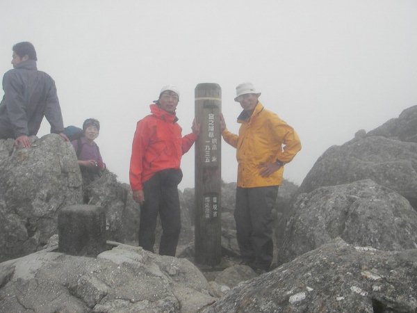 山全体が霧に覆われ、屋久島全体の姿は見えないのは残念だが、天気が良かったらこんな景色が見えるだろうと想像しながら下山する。銃走路に戻ると、後から登ってきた人たちが、大勢歩いていた。投石岩屋の大きな岩の上で大休止をし、昼食をとった。道自身はそんなに急ではないが、登ったり下りたり、宮之浦岳は遠くなかなか着かない。栗生岳の下りで一瞬霧が晴れた時、風で波打っている笹の中に、どっしりと白く大きな岩が点在している宮之浦岳が見えた。やっと来た。強い風の中を身を低くするように山頂に向かう。笹と花崗岩をぬいながら山頂に着いた。風が強いため休むのは下に下りてからにしようと記念写真を撮っただけで下山を開始した。ちょうど下りきった所に永田岳への分岐があった。