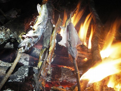 大ガランと呼ばれるガレ場を通過して、もうヘロヘロになったところでようやく18時前に予定の天場に到着。焚き火をおこして夕食の段取りをしながら竿を振ると、ぶちは2匹を続けてゲット。入れ食いだと喜んでいる。初めて釣りをやるヤブちゃんもいい型をヒット。俺のテンカラだけ釣れない。塩をまぶして焚き火で串焼きにして食べる。チョー旨い。
