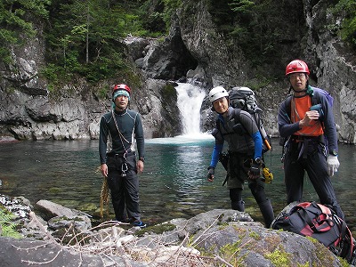 イワナ淵では早速泳いで感触を試す。続いて現れたニエ淵では見るからに釜からの登り口が難しそうだ。水泳隊長の藪崎君(ヤブちゃん)が空身で泳ぎ、なんとか滝の右岸にルートを見つけて這い上がる。上から補助ロープを投げてもらい、ぶちがバックロープを着けて這い上がる。3個のザックを全部くくりつけて、ラスト田中がザック共々引っ張ってもらい這い上がる。何度かへつりと泳ぎを繰り返す。