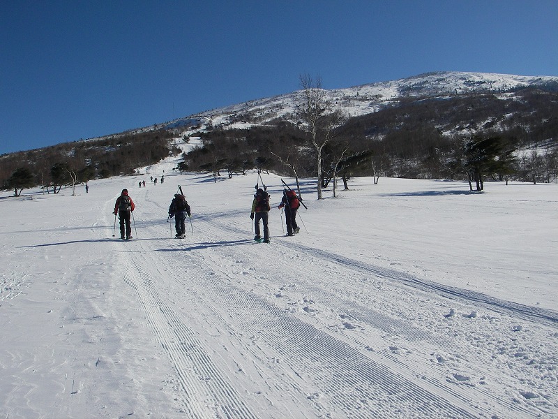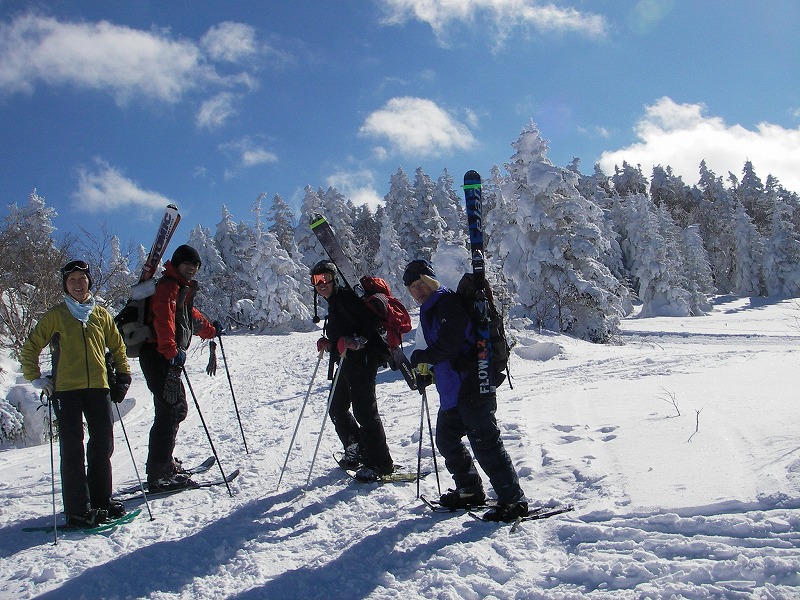 期 日 2009年1月24日〜25日 メンバー 工藤会長、曲渕、工藤m、永田、田中(記録) 行動記録 24日 菅平到着後フリースキー(工藤m、永田) 根子岳頂上へ(田中) 25日 全員で根子岳スキーツアーへ 9:25リフト降り場-12:10根子岳山頂-12:30滑走-13:00スキー場 今回の月例山行は先発隊、後発の2班に分かれて現地合流になった。先発の我々3人は宿泊先のホテル白樺荘に荷物を置いて、工藤mさんと永田さんはゲレンデスキーを楽しむ。 田中は明日の下見がてらシュナイダーゲレンデからシールを着けて行けるところまで行ってみようと歩き始める。高校生の団体がスキースクールで楽しげに滑っている。傾斜がゆるいのでシールでの登りもそんなにきつくない。天気は今いちで時折パラパラと雪が降ってくる。 ゲレンデの最上部まで1時間半くらいで着いた。ガスっているが根子岳ツアーコースに入り、下ってきた人に頂上までの所要時間をきいてみると「2時間くらいで行けるよ」と返事が返ってきたので、よし!頂上までいくぞとピッチを上げる。 昼ごろ工藤mさんから携帯に電話が入り、「私たちはホテルで名物のカツサンドを食べているところよ。」と話しを聞いているだけで、ヨダレが出てきた。下界に戻りたい気分になったが、そのうちに晴れてきて、頂上も見えてきた。樹氷の間を抜けるとすぐに頂上だった。写真を撮って直ぐに滑走の支度をする。雪はパウダーとまではいかないが、締まっていて滑りやすい。 谷筋に入らないように注意して、あっという間にゲレンデ上部まで下る。宿に帰って風呂で暖まり、夕食はロシア料理のボルシチスープや分厚いビーフ料理をいただく。 翌日奥ダボススキー場で工藤さん、曲渕君と合流してフード付きトリプルリフトに乗り、ゲレンデ最上部まで一気に上がる。スキー場のスピーカーからは流行歌がガンガン鳴っていてうるさい。天気は最高で、日焼けが気になる。 山スキーヤー、ボーダー、普通に歩く人などたくさんの人がツアーコースを登っていく。我々5名は曲渕君と田中が山スキーを履き、工藤夫妻と永田さんはスノーシューを履いてスキーを担ぎ、ゆっくりペースで歩き始める。 ゲレンデでもないのに早朝から圧雪車がかなり上まで入っているらしく、歩きやすい。山頂近くの樹氷は昨日にも増して美しく、みんなで記念写真を撮る。