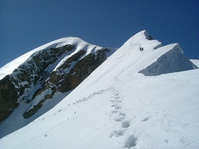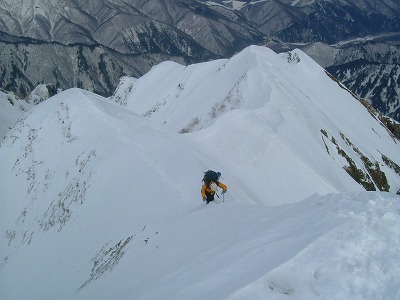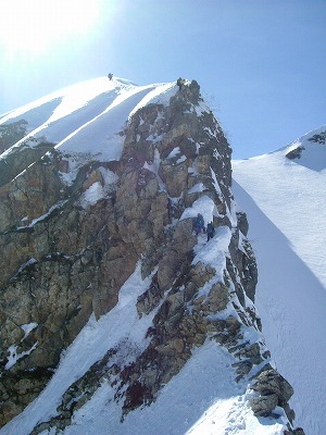 今度はオレの番だ。取り付いて分かったが、20キロのザックを背負ってのクライミングは厳しいものがある。残置スリングをゴボウで掴み、エイヤッで登るが腕が攣りそうになる。どうにかたどり着き、後は快適な雪稜を北峰に向かって直上する。