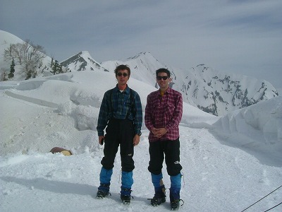 真っ白な冬毛に少し褐色が混じった雷鳥を数羽見かける。まだ餌が少ないせいか縄張り争いをしている様子だ。雪山にも春は確実に訪れている。山荘から赤岩尾根への下りはかなりの傾斜で、後ろ向きでアックスをきかせながら降りる。デブリの痕もあるので、静かに速やかに通過したいがアイゼンが団子になり時間がかかる。雪が緩む今の時期は重要な問題である。次回は対策を考えよう。後ろから来た2人は西沢を下って行った。しばらくして地響きが鳴り、ドでかい雪崩が沢に落ちる。あの2人は大丈夫だっただろうか?